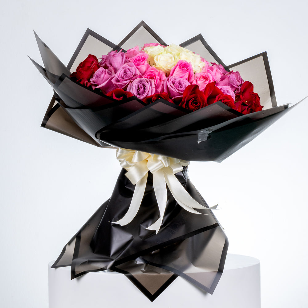 50 fresh, hand-selected mixed roses, carefully wrapped in premium floral paper.