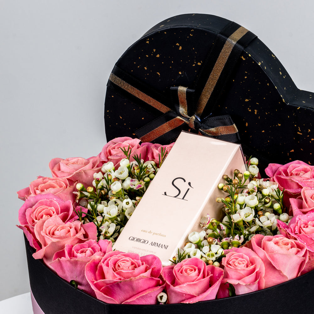 Includes: Armani Si EDP 100ML + 16 fresh roses with wax in a heart-shaped box