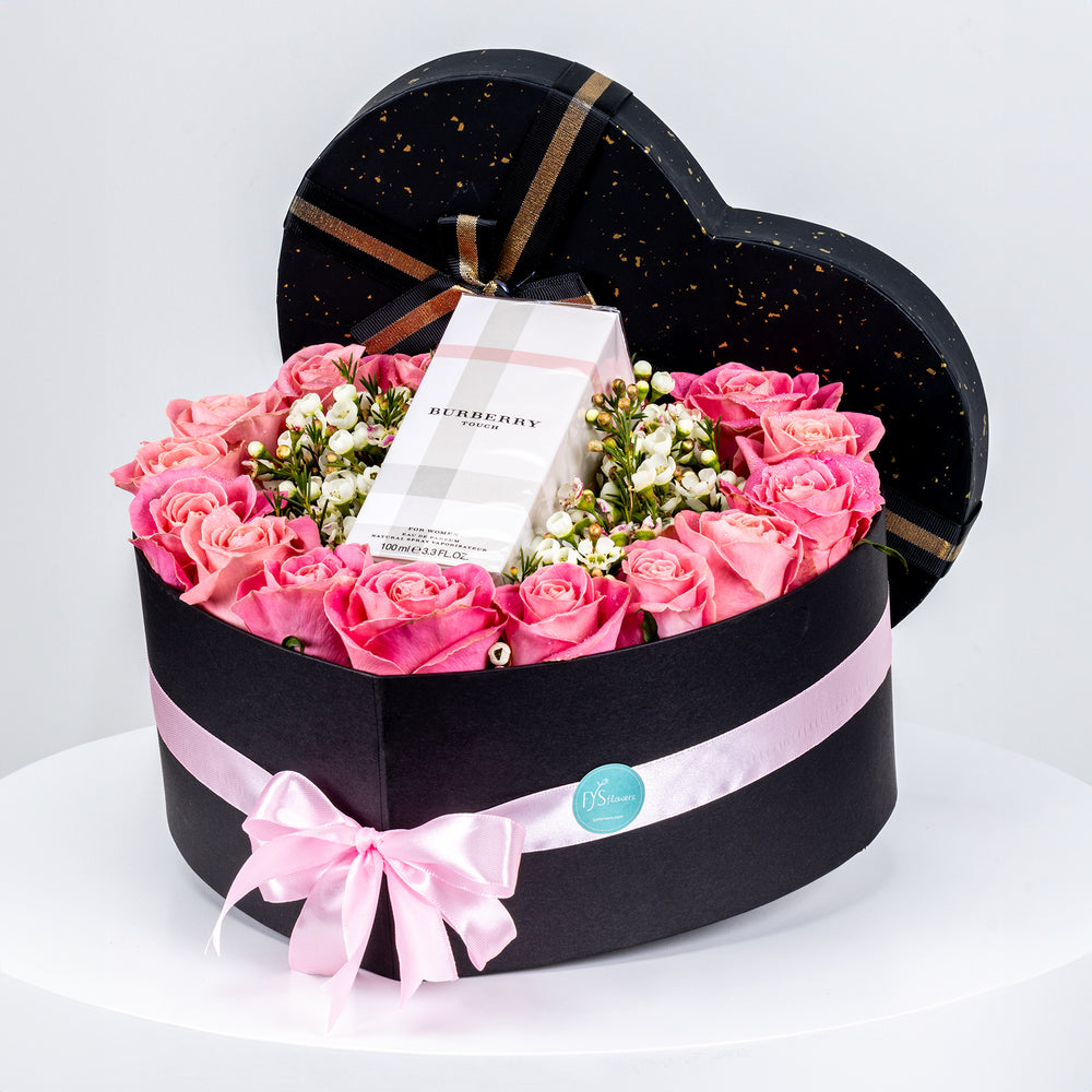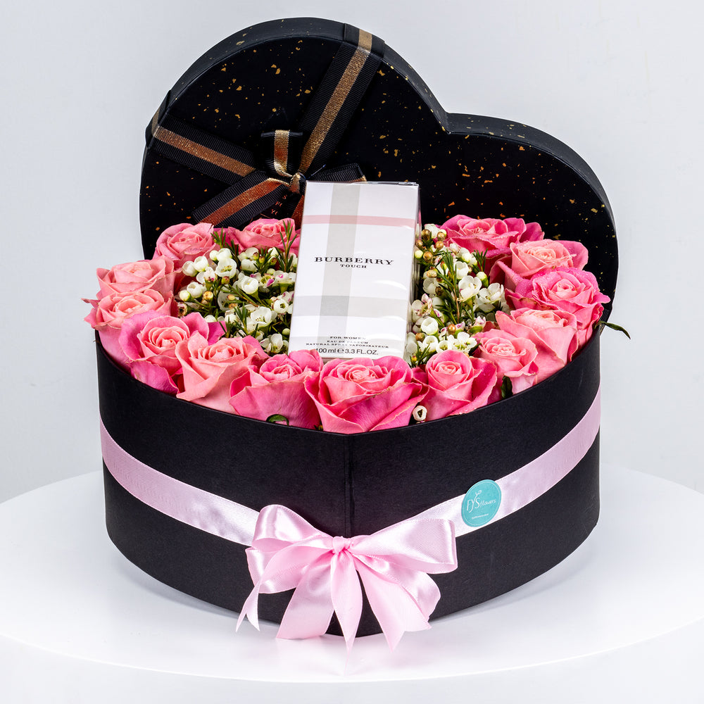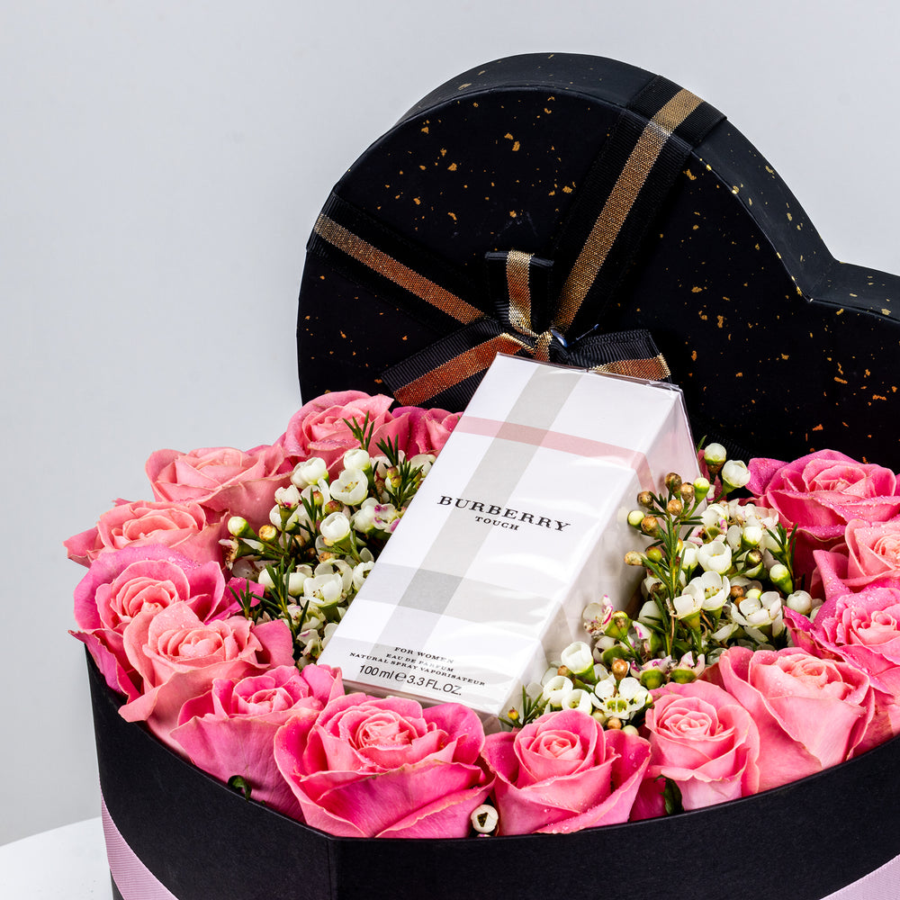 A heart-shaped box with 16 fresh roses in your chosen color, along with a full-size Burberry Touch L EDP (100ML).